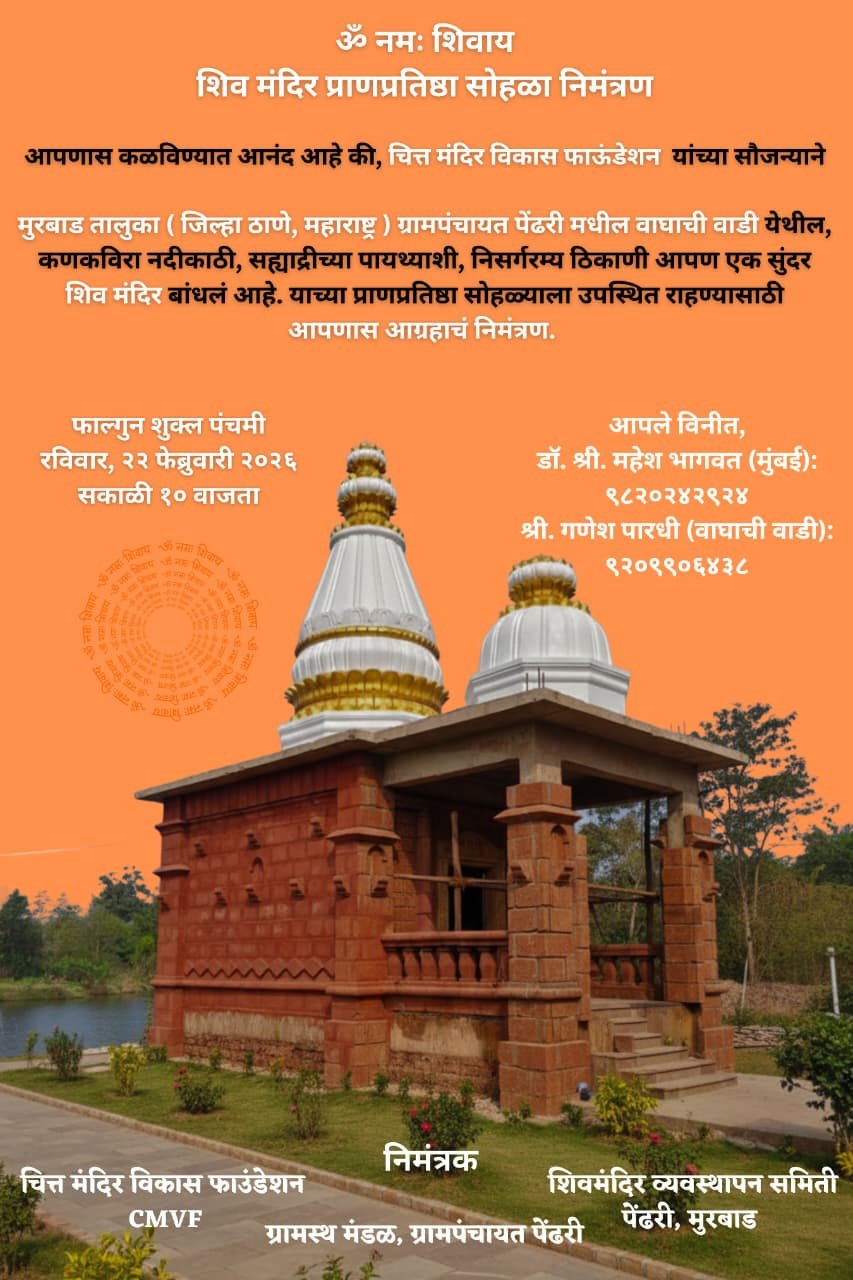 Citta Mandir Vikas Foundation cordially invites devotees and well-wishers to the Pran Pratishta Ceremony of the newly constructed Shiv Mandir, located in a serene and natural setting along the banks of the Kanakveer River, at the foothills of the Sahyadri ranges.